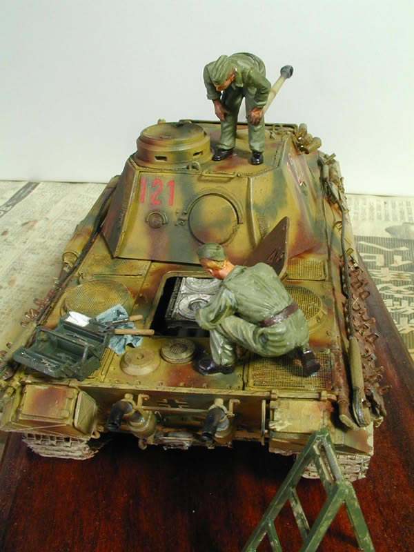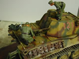 イタレリのパンターD型です。25年ぶりくらいのパンター!楽しく作れました。キットはA型と特徴の混ざったD型の後期型と初期型がごちゃ混ぜになっているのでなるべく初期型に戻しました。転輪の16本ボルトはやっていませんが・・・。どうせ泥で見えないので起動輪をモデルアーティザン・モリの起動輪セットを使用しました。あと、アベールのエッチング、クリッパーのキューポラ、モスキットのマフラーなどけっこうアフターパーツを使用しています。効果のほどはわかりませんが(笑)まあ、自己満足の世界なのでアフターパーツの購入や選択も模型趣味の楽しみの1つかと思っています。私的にはエレファントの砲身はアルミ製の防楯もついてお買い得だと思います。ワイヤーもおすすめです。フィギュアはタミヤのエンジン整備セット。ヘッドだけホーネットとウォリアーに変えてあります。一部パーティングラインが残っています。気がつきませんでした。(泣)工具はショウモデリングのエッチングパーツを使っていますがいい感じですね。特にプライヤーなどいいですよ! |
